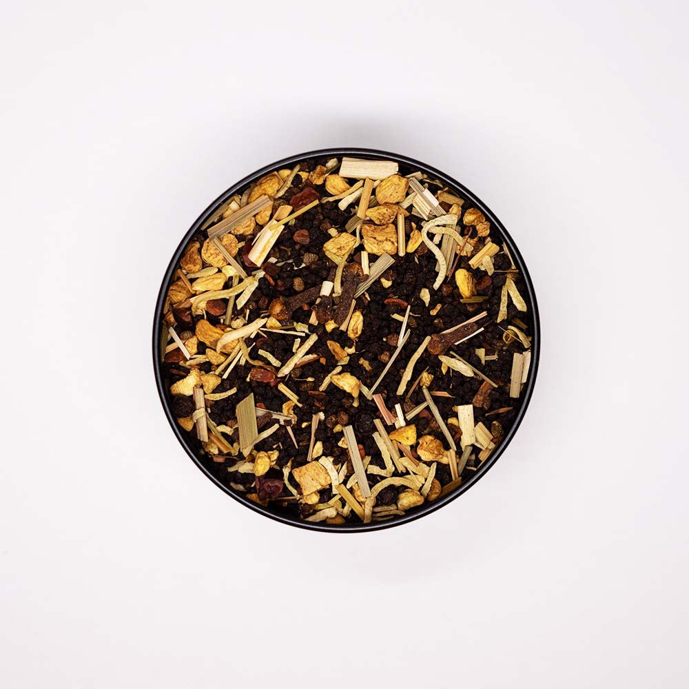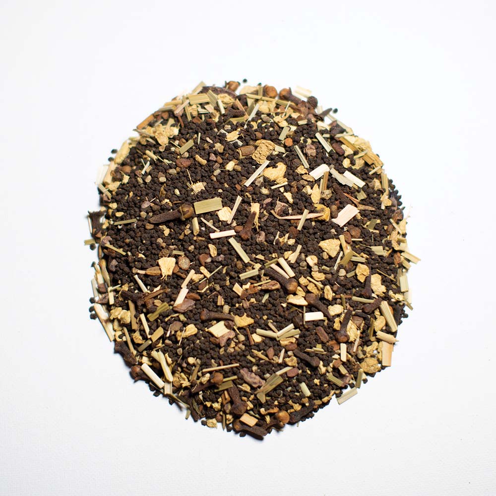 Ingredients:ย Assam CTC Black Tea, Cardamom Seeds, Ginger Root, Coconut Shreds, Cinnamon Chips, All Natural Flavor, Lemongrass, Whole Cloves, Black Peppercorns, Cocoa Nibs.